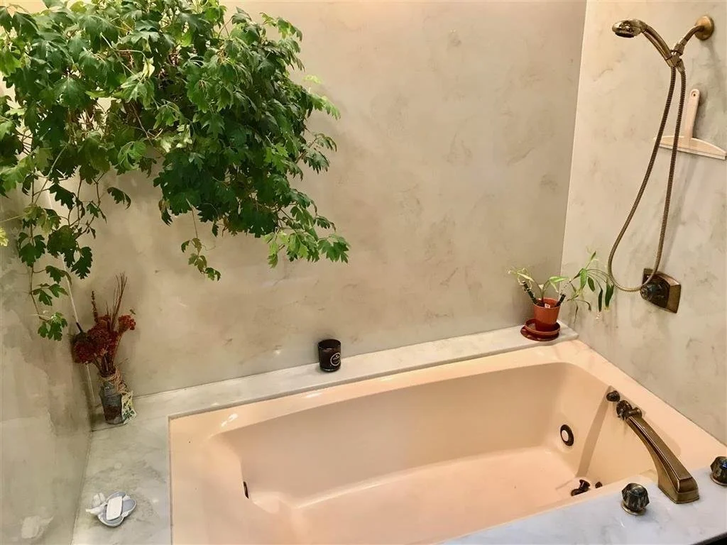 This custom-tiled, cub-less, two-way shower includes a programmable heated floor. This primary bathroom is a dream.